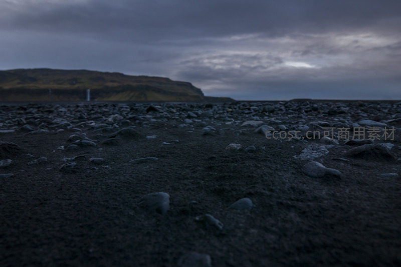在昏暗天光下,前景是布满大小不一黑色卵石的滩涂,视线延伸至远方山体轮廓,一道细长瀑布如银线般悬挂在崖壁,整体色调冷峻,弥漫着神秘与静谧之感。