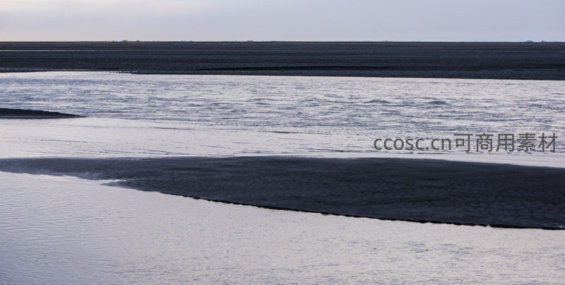 广阔的黑沙滩与波光粼粼的海水相接,潮水轻柔拍打岸边,远处地平线模糊,营造出空旷而宁静的自然氛围。