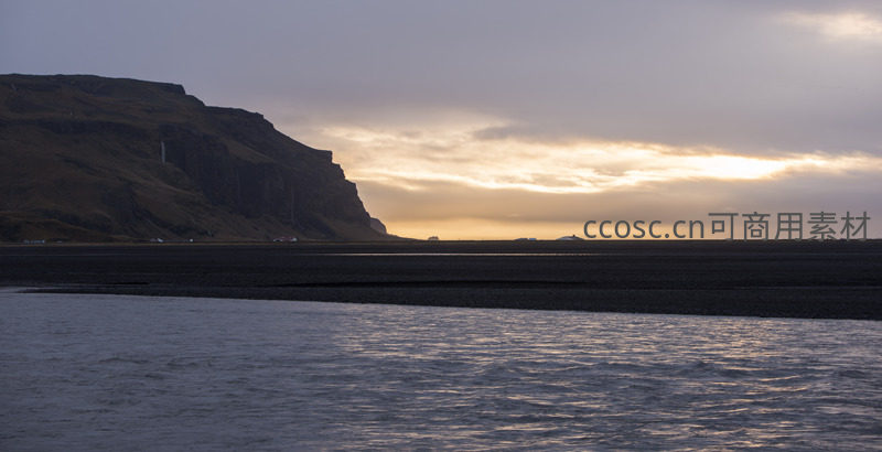 陡峭山崖在暮色中化作深色剪影,金色霞光穿透云层倾泻于黑沙滩与海面,远方小屋若隐若现,构成一幅诗意的黄昏画卷。