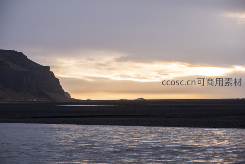 柔和暮光笼罩广袤黑沙滩,左侧山峦轮廓清晰,右侧云层透出暖光,水面倒映天色,天地交融,传递出无垠的宁静与壮美。