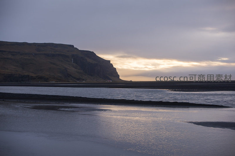 广阔的湿地在黄昏时分泛着粼粼波光,天空的霞光温柔地洒在水面上,形成如镜面般的倒影,远处山峦轮廓模糊,整个画面充满诗意与宁静。