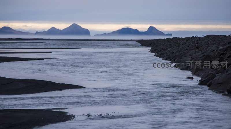 清澈水流沿人工石堤缓缓前行,两岸黑沙与远处雪山相映成趣,展现人与自然和谐共存的壮丽景象。