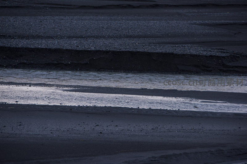 近距离捕捉黑沙与浅水交界的细腻纹理,水面反射着幽微天光,在明暗对比中形成富有节奏感的几何线条,展现大地肌理的抽象美感。