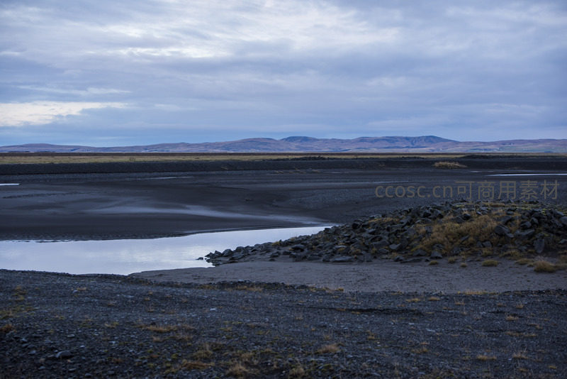 一片由黑色火山土构成的广阔河滩,一条细窄的溪流如银带般蜿蜒其间。远处是起伏的丘陵和朦胧的山峦,在多云天空下勾勒出柔和的天际线,展现原始地貌之美。