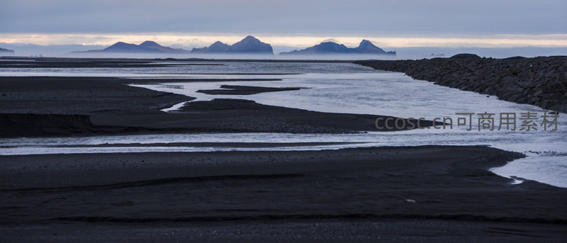 清晨薄雾笼罩下的黑沙滩,蜿蜒溪流穿行其间,远处山峦轮廓朦胧,天地间一片静谧,展现冰岛独特地貌的原始之美。