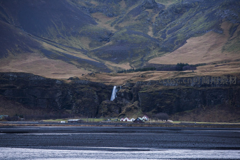 一道白练般的瀑布从陡峭山崖飞落,山脚下散落几栋彩色小屋,与广袤荒原和起伏山峦相映成趣,勾勒出人与自然和谐共处的画面。
