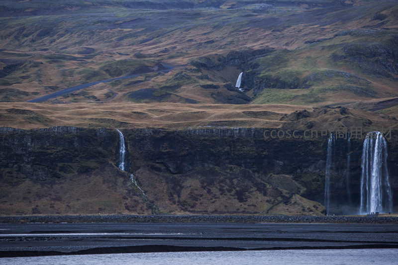 画面中分布着大小不一的多处瀑布,主瀑布气势恢宏,旁侧小瀑点缀其间。山体覆盖枯黄与翠绿交织的植被,前景是宽阔的河滩,展现大地的粗犷与柔美。