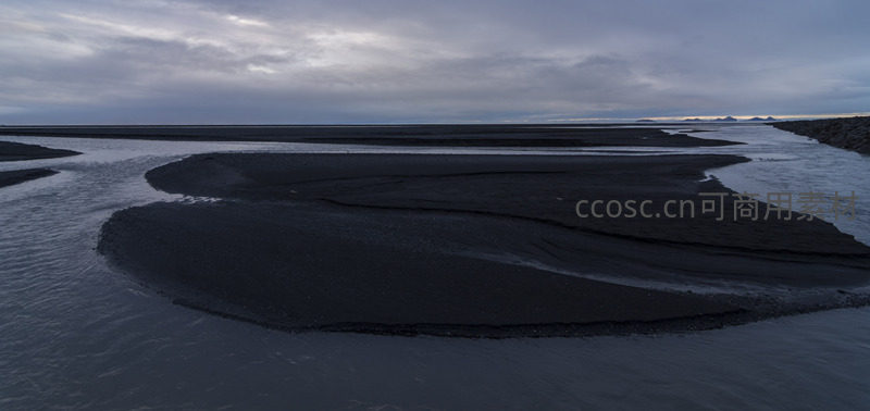 黑沙滩蜿蜒河流,暮色苍茫如水墨
