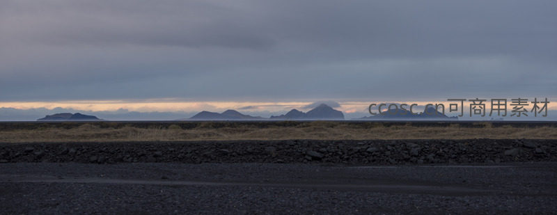 远方山脉轮廓清晰,与灰蓝天空相接,近处荒原寂静无声,地平线处霞光微露,展现北欧式苍凉壮阔的自然画卷。