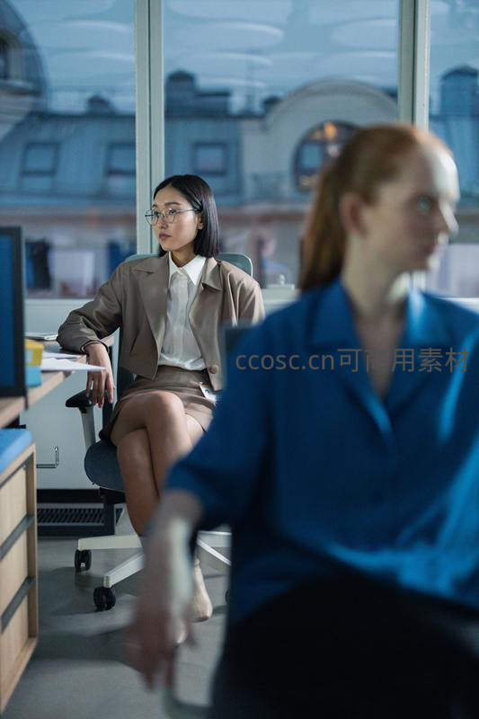 一位戴眼镜的职场女性坐在办公椅上,目光投向窗外的城市景观,前景中另一位同事走过,营造出忙碌而沉思的工作氛围。