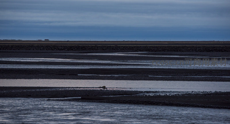 低饱和色调下,宽阔河床被分割成条状水域,远方地平线模糊不清,整幅画面透出孤寂与时间停滞般的诗意美感。
