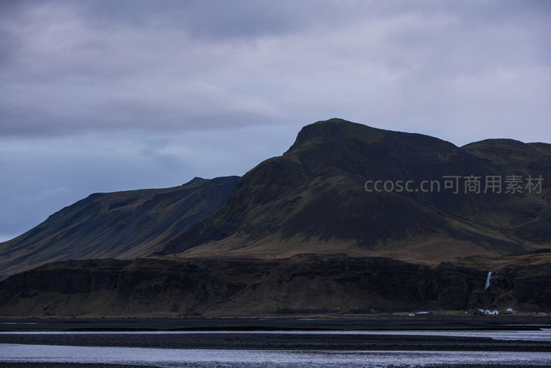 巍峨山体覆盖褐绿植被,山脚隐约可见细小瀑布,前方是开阔湿地平原,整体构图层次分明,充满原始自然力量。