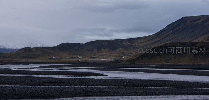 远处雪峰隐现于阴云之下,山麓散布零星房屋,前景是黑褐色河滩与浅水带,营造出人迹罕至却安详的边陲意境。