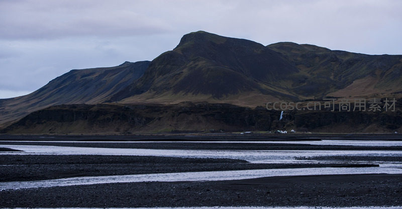 高耸山体下,一道细小瀑布从岩壁倾泻而下,汇入前方开阔的湿地平原,水道纵横交错,画面宁静而富有层次,体现原始自然的力量与美感。