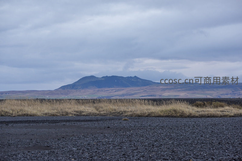 前景为细腻的黑色火山砂砾,中景是成片枯黄草丛,远景是轮廓分明的山峦,在阴云笼罩下形成强烈色彩与质感对比,凸显大地的粗犷与诗意。