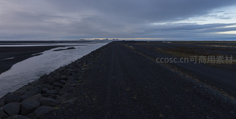 一条由黑砂铺就的公路笔直伸向远方地平线,一侧是奔流的河水,另一侧是荒芜旷野,灰蓝天空下弥漫着孤寂而充满探索感的旅途氛围。