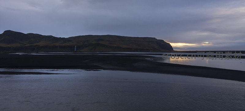 黄昏时分,广袤的黑色沙滩延伸至远方,平静水面映出天边微光,连绵山脉在薄雾中若隐若现,营造出苍茫而静谧的北欧自然意境。