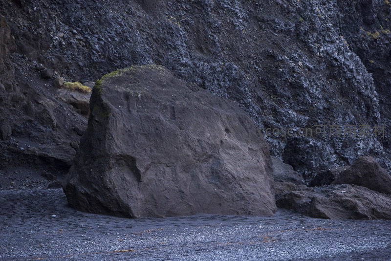 一块巨大的玄武岩孤石静卧于黑沙滩之上,背景是陡峭的火山岩壁,整体画面宁静而神秘,体现自然力量与时间沉淀的和谐。