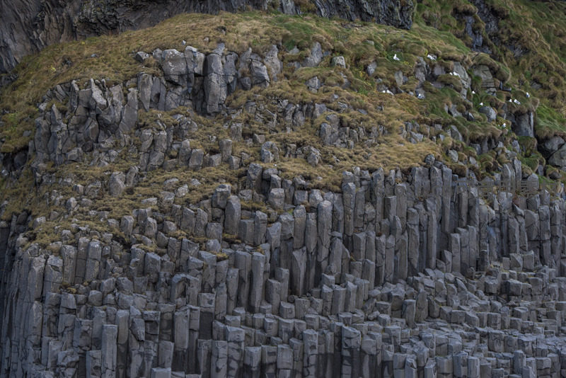 壮观的玄武岩柱状节理,如人工雕琢般整齐排列,顶部覆盖稀疏草甸,展现大自然鬼斧神工的地质力量与原始美感。