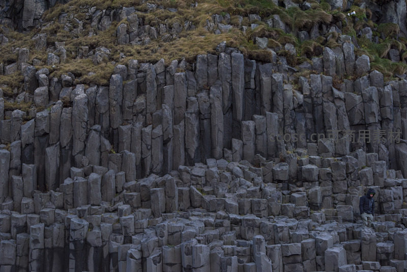 一名游客置身于巨大的玄武岩柱阵列中,渺小的身影衬托出地质构造的宏伟壮丽,体现人与自然的和谐共处与探索精神。