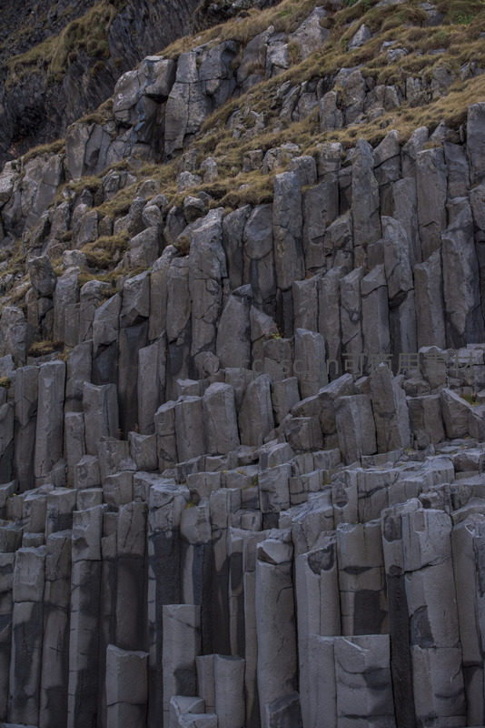层层叠叠的火山岩柱如同大自然精心雕琢的雕塑群,灰黑色调与斜坡上的枯草形成对比,呈现原始而震撼的地质美学。