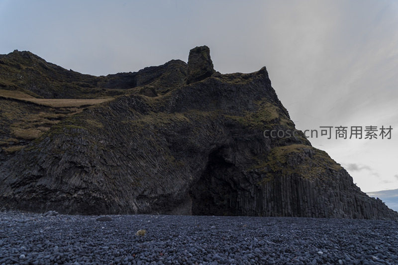 陡峭的玄武岩山峰从黑石海滩拔地而起,垂直的柱状结构清晰可见,天空微亮,海风轻拂,展现出冰岛式海岸的独特地质魅力。