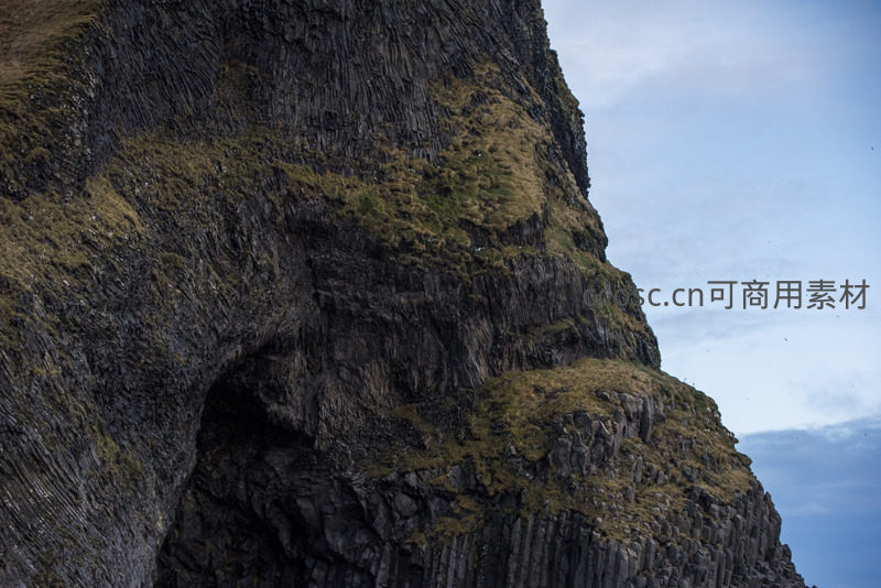 壮观的玄武岩柱状节理构成陡峭悬崖,底部形成天然洞穴,顶部覆盖稀疏草甸,展现大自然鬼斧神工的地质构造。