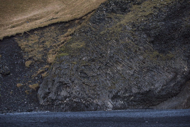 倾斜的玄武岩层延伸至海边,被海水轻柔拍打,岩层纹理清晰可见,展现了地质运动与海洋侵蚀共同塑造的地貌特征。
