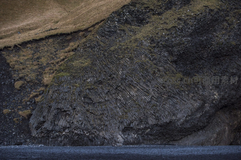 巨大的火山岩壁从陆地向海面倾斜,表面布满风化痕迹与苔藓,下方平静的海水映衬出岩石的厚重感,营造出静谧而宏伟的氛围。