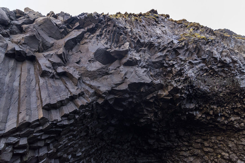 近距离观察火山岩层断裂面,层层叠叠的岩石结构清晰可见,部分区域覆盖着绿色苔藓,展现自然力量塑造地貌的原始美感。