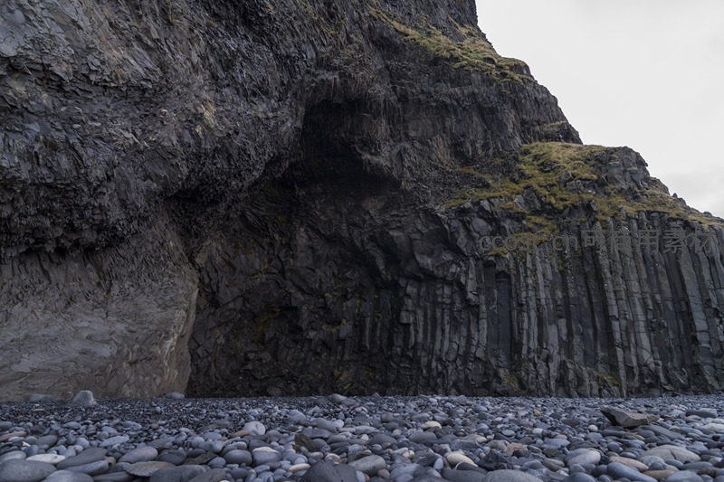 黑沙铺就的海滩前,高耸的玄武岩峭壁拔地而起,规则柱体与不规则岩面形成强烈对比,尽显自然原始之美。