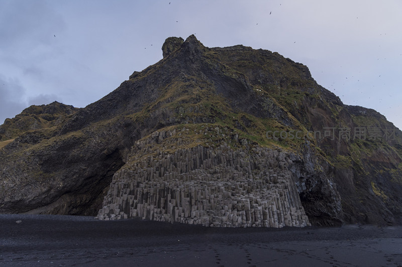 由无数六边形玄武岩柱组成的巨大岩壁矗立在黑沙滩旁,其规整的几何形态令人惊叹,是火山活动后冷却形成的独特地质结构。