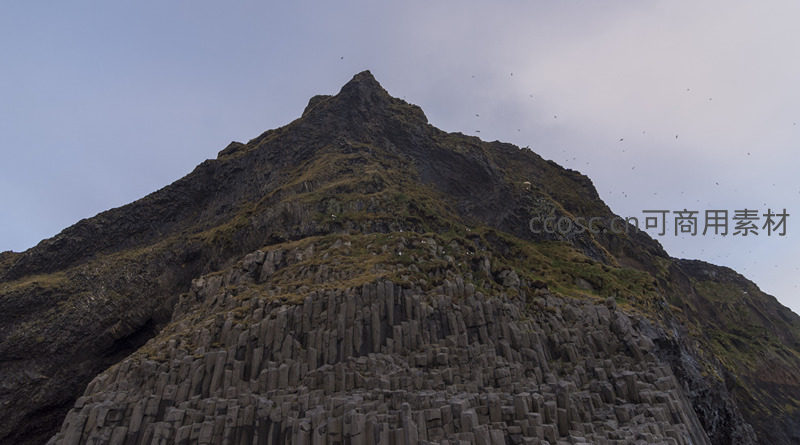 镜头向上捕捉陡峭山峰,底部规则的柱状玄武岩层层叠叠,山顶覆盖着绿色苔藓,空中有飞鸟掠过,营造出一种雄伟、神秘且充满生命力的氛围。