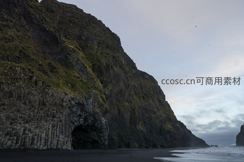 玄武岩柱状节理峭壁,海鸟盘旋其上