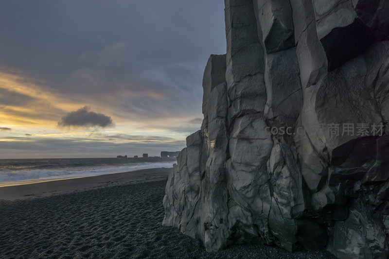 夕阳染金海岸,巨岩矗立黑沙滩前