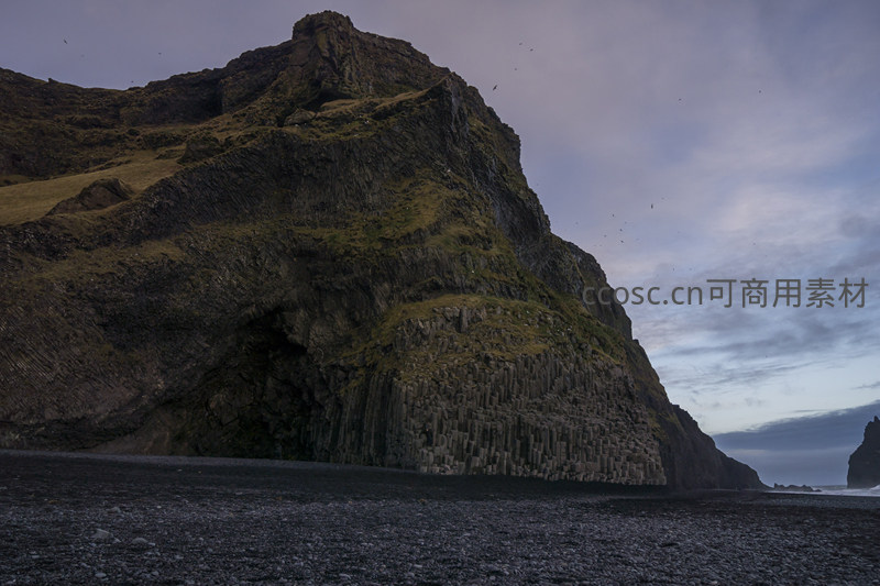 在暮色笼罩下,覆盖着青苔的玄武岩悬崖显得格外雄伟,崖壁下隐藏着一个天然洞穴,远处海天相接,几只海鸟掠过,为这片原始地貌增添了生机。