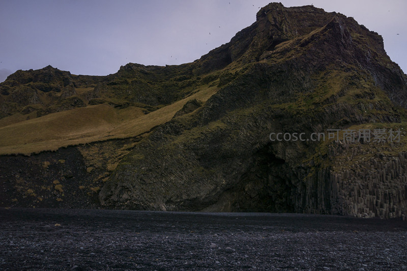 黑色的火山砂砾铺满前景,背景是高耸的玄武岩山体,其岩层结构因风化和侵蚀而层次分明,展现了地球内部力量塑造地表形态的漫长过程。