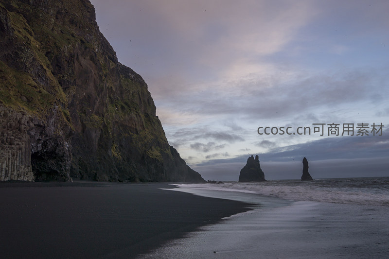 在冰岛标志性的黑沙滩上,巨大的玄武岩海蚀柱矗立于波涛汹涌的海面,远处悬崖与多变云层共同构成一幅雄浑而宁静的自然画卷。