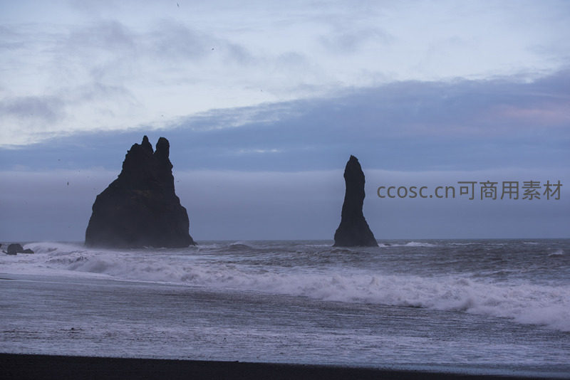 两座巍峨的海蚀柱在灰蓝色天空下静默伫立,海浪拍打着黑色沙滩,水沫翻腾,营造出一种苍凉而壮阔的北欧海岸氛围。