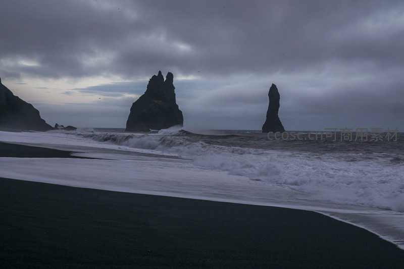柔和的海浪缓缓漫过细腻的黑沙,远处两座海蚀柱在阴沉天空中轮廓分明,整个画面充满诗意与宁静,仿佛时间在此刻凝固。