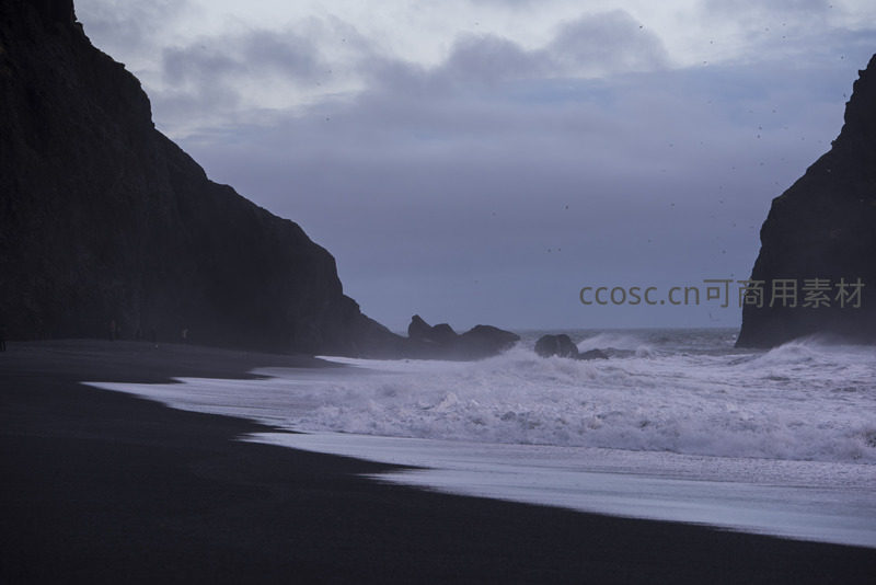 两侧陡峭悬崖环抱,深色沙滩与翻腾白浪形成强烈对比,灰蓝色天空压顶,营造出一种苍凉、孤寂又充满力量感的海滨氛围。
