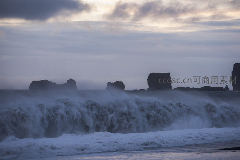 滔天巨浪裹挟着白色泡沫奔腾向前,远处数座形态各异的黑色礁石屹立海中,天空云层低垂,整个画面充满动感与原始野性之美。