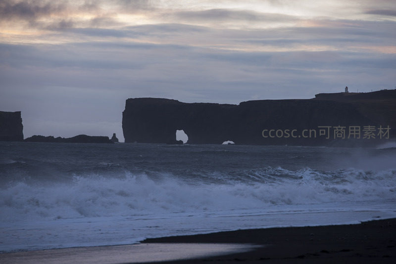 汹涌的海浪拍打着黑色的火山砂海滩,远处矗立着巨大的玄武岩悬崖和天然拱门,天空被暮色染成灰紫,营造出壮阔而神秘的自然奇观。