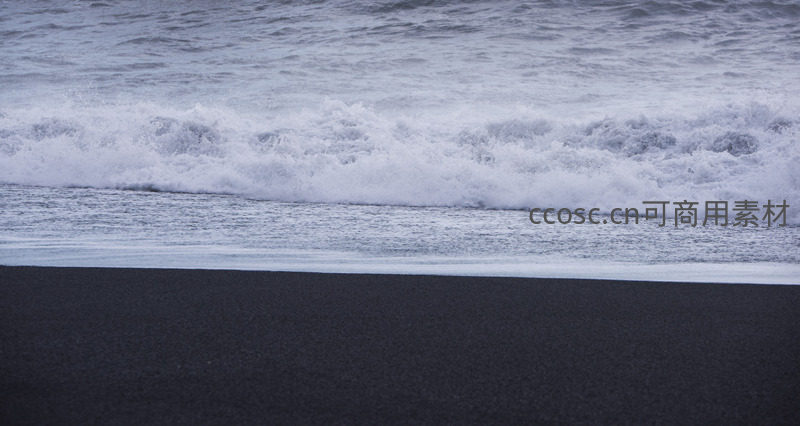 镜头聚焦于翻腾的浪花与细腻的黑色沙滩交界处,泡沫飞溅,水纹清晰,展现了海洋与陆地接触瞬间的动感与质感,极具视觉冲击力。
