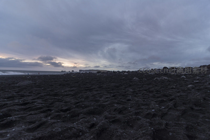 从低角度仰望,黑色的沙滩布满碎石与脚印,延伸至远方咆哮的海面,天空乌云密布,仅有一线微光穿透,营造出苍茫孤寂的史诗感。