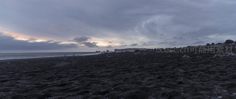 广阔的黑沙滩在黄昏时分延伸至天际,厚重的云层下透出柔和霞光,远处海浪轻拍岸边,几位游客点缀其间,营造出静谧而壮丽的自然画卷。