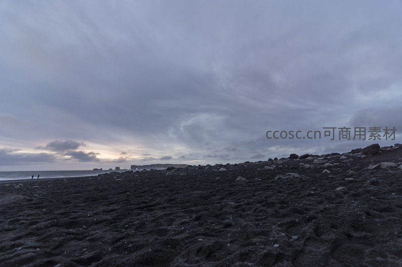 低角度拍摄的黑沙滩上,细腻的火山砂粒与远处波涛相接,天空被灰白云层覆盖,远方隐约可见礁石和渺小人影,整体氛围沉静而富有诗意。