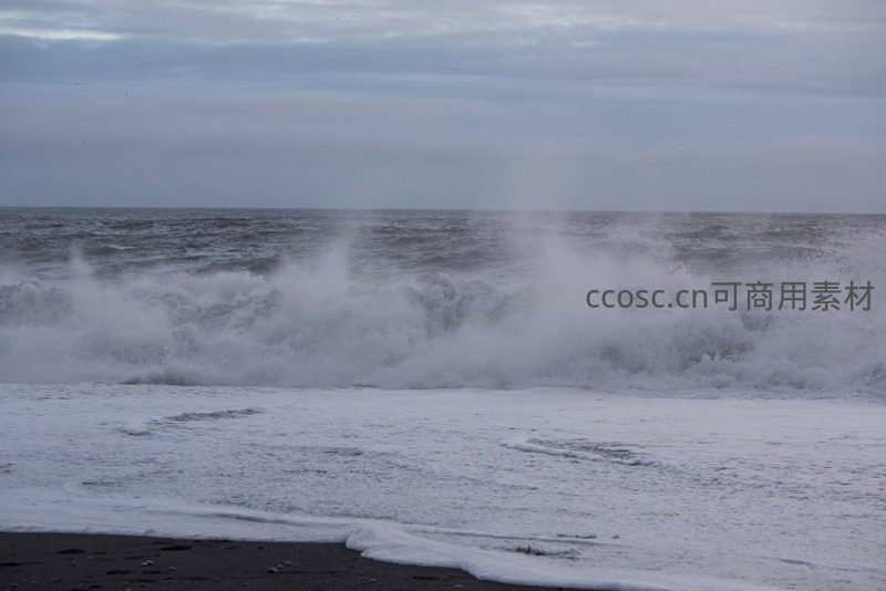 狂风卷起巨浪猛烈冲击海岸,水雾弥漫空中,浪花四溅,展现出大自然原始而震撼的破坏力与壮丽景象。