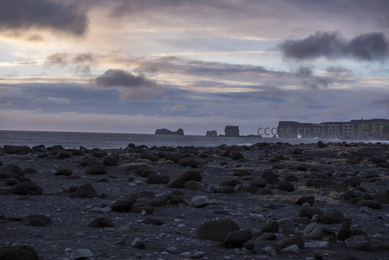 暮色笼罩下的火山岩海滩,遍布大小不一的黑色卵石,远处海面上矗立着几座形态各异的礁石,天空云层厚重,透出微光,意境苍凉而壮阔。