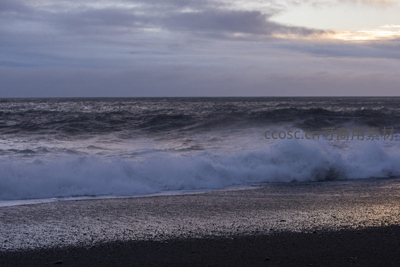 巨浪扑向黑沙岸,水花飞溅映霞光
